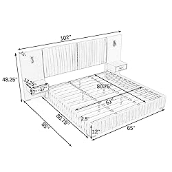 【Luxury Oversized Headboard Design】: The 102" extra-wide upholstered headboard instantly becomes the focal point of your bedroom. Plush chenille fabric and bold tufted lines give this luxury bed frame a grand, hotel-inspired look while offering full back support for reading or lounging 【Integrated Nightstands with Adjustable Lamps】: Designed for function and elegance, this modern platform bed with nightstands frame includes two built-in shelves and flexible bedside lamps. Adjust the angle or brightness for reading or nighttime ease—no bulky side tables needed, just sleek convenience 【Handcrafted Details & Modern Aesthetic】: The contemporary queen upholstered bed frame uses hand-pleated upholstery for soft texture and artistic flow. Light and shadow play beautifully across its wavelike form, creating a calming yet sophisticated centerpiece that fits any decor style 【Quiet Strength & Easy Maintenance】: Sturdy slats attach with Velcro to prevent shifting and noise. This queen upholstered bed frame supports 8"–12" mattresses securely without a box spring. Built for stability, the platform bed frame offers a solid and quiet sleep experience night after night 【Quick Assembly & Perfect Fit】: Assembles easily with clear instructions and all tools included. Overall size: 102"W x 85"D x 48.25"H. Bed area: 65"W x 80.75"D x 12"H. A platform bed queen that merges modern style, comfort, and smart functionality into one cohesive design. Easy assembly ensures years of reliable use, professional service team around the clock for peace of mind