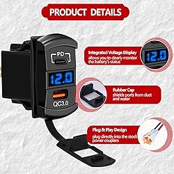 - Product Name:Charging Outlet Charging Port Type:USB+Type C Features:Voltage Display Switch Indicator:Blue Backlight Wire Gauge:18AWG Total Wire Length:2.5 FT Operating Voltage:12V Fuse Type:Blade Fuse Installation:Plug & Play
