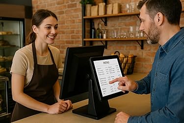 🧾 Compact & Space-Saving Design: The 12” screen fits comfortably on any countertop while providing sufficient display area for customers to view transaction details, receipts, or promotions. 📐 Optimized 4:3 Ratio for Dual-Monitor Compatibility — The 4:3 aspect ratio perfectly matches many industrial and POS software layouts, making this monitor ideal as the main screen in dual-display setups. It maintains correct interface proportions without stretching or cropping, ensuring seamless visual alignment with secondary widescreen displays. This design delivers better vertical viewing for stacked menus and control panels, preserves button placement accuracy for faster operation, and ensures full compatibility with legacy 4:3 applications — creating a smooth, balanced, and professional dual-monitor environment. 🌟 Perfect Match for ANGEL POS HD Series: The 1024 x 768 HD resolution aligns beautifully with ANGEL POS HD Series 15” and 17” touch screen monitor monitors, creating a consistent multi-screen setup for professional dual-display POS stations. 🔌 Dual Connectivity (HDMI + VGA): Connect easily to Mini PCs or desktops devices. Dual ports provide maximum compatibility with both new and legacy systems, ensuring easy setup in any environment. 🤏 10-Point Capacitive Touchscreen: Supports fast and responsive touch control, ideal for interactive applications such as checkout screens, ordering systems, and digital menus. 🧼 Edgeless, Bezel-Free Flat-Front Design – Sleek modern look with no raised edges, allowing for effortless cleaning and a premium appearance that blends into both retail and industrial settings. By eliminating crevices or edges where water or dust could accumulate or penetrate, this seamless flat capacitive touch screen remains functional even in challenging conditions. The seamless construction enhances resilience against water and dust ingress, ensuring durability and reliability in various environments. This feature is particularly valuable in industrial, outdoor, or high-traffic settings where exposure to moisture and debris is common ⚙️ Adjustable Metal Stand for Ergonomic Viewing: Tilt the sturdy metal stand to find your ideal viewing angle. Built for stability and longevity, it stays firm on the counter even with heavy daily use. 💧 Waterproof Control Placement – All control buttons are located at the back of the monitor, preventing accidental spills or splashes from affecting performance. Perfect for kitchens, bars, and manufacturing floors.