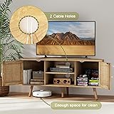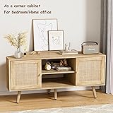 UNDUSLUY Corner TV Stand for 55 inch TV, Corner Entertainment Center with Storage, Boho Media Console with Rattan Doors, Solid Wood Feet, 2 Cord Holes, for Living Room, Natural