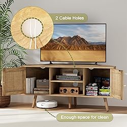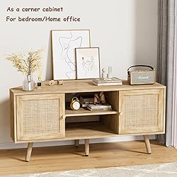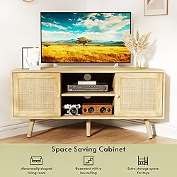 【Support Up to 55 Inches TV】Suitable for TV up to 32 inches, 40 inches, 55 inches. Spacious desktop: 45.3'' x 20.5''( NOTE: please make sure the distance between your TV legs is less than 55 inches before purchasing) 【Maximize the utilization of space】 This unique corner entertainment center can be used in any corner especially for abnormally shaped living room, basement with a low ceiling and extra storage space for apartment 【Long-lasting Corner TV Stand】 The corner tv cabinet combines a engineered wood top with adjustable solid wood legs, supporting up to 100lbs. Waterproof and scratch-resistant tabletop is good for for your beloved decorations. Rattan surface provides breathability for your electronic devices 【Multi-Compartment Storage Space】2 open shelves with cable holes can be used to place speakers, game player and DVDs. In addition, 2 hidden spaces with rattan decorated surfaces can accommodate your items to keep the room tidy 【Easy to Assembly】With numbered parts, clear instructions, and included assembly tool, you can easily get this boho corner tv stand for 55 inch tv. Slight color differences under different lighting