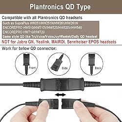 【Compatible with Plantronics QD Headsets】: This QD headset adapter is compatible with All Plantronics Quick Disconnect (QD) headsets, including H251, H251N, H261, H261N, HW291N, HW301N, HW710, HW720, and all H-series & all HW-series and same style QD like TruVoice/VoiceJoy/Wantek/Daily QD headset. NOT for C, Yealink, MAIRDI, Sennheiser EPOS headsets. 【USB-A Compatibility】: This USB QD adapter, 159cm/5.2ft long, is compatible with computer, laptop, PC, desktop, Mac, Windows, Linux, Google, Skype, softphone, Microsoft, Lync, Cisco, etc. Perfect for home, office, business, call center, conference calls. 【Plug and Play】: Simply connect the QD connector to your QD headset and plug the USB A port into your computer. Support professional in-line volume controls & mute microphone/speaker. Ready to talk and listen without having to install software. 【Super Durability】:The QD to USB cable adopts durable PU material and flexible cable, protecting the high-purity copper conductors inside, and providing safe insulation and good toughness to enhance the durability for a longer lifespan. 【Notes and Warranty】: This Quick Disconnect to USB cord is ideal to connect your QD headset to USB devices. Please check the ports of your headset and device before purchasing. And we offer 45 days money back & 1 year worry-free guarantee for the QD adapter.