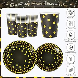 【Black and Gold Party Supplies】Total of 168pcs - Serves 24 guests. Includes 24pcs 7in plates, 24pcs 9in plates, 24pcs napkins, 24pcs cups and 24 sets gold cutlery (knife, fork, spoon). Perfect for holding snacks, cakes, drink, fruits, desserts and more at parties. These disposable party tableware are the perfect choice for gatherings—simple to decorate and convenient to use. Sufficient quantity to serves 24 guests, providing ample supplies for Birthday, Graduation, Wedding, Valentine‘s Day, Retirement, Anniversary, Father's Day etc. 【Black and Gold Dot Paper Plates and Napkins】The plates and napkins feature a classic color scheme of black, adorned with gold dots. The dots are embossed with gold foil, shimmering beautifully under light. The colors are vibrant and bright, with crisp, fade-resistant printing. When set on the table, this tableware creates a joyful and festive atmosphere, effortlessly crafting the perfect party ambiance for family and friends. 【Party Disposable Tableware Set】This party plates are made of sturdy paper, thick and not easy to tear, resistant to cutting and not easy to leak. Perfect for serving cakes, sandwiches, salads, fruits and snacks at parties. It is very suitable for both assembling dishes and main courses. The napkins consists of four layers, which are very tough and soft with high absorbency. Provide guests with a great dining experience! 【Enjoy Party Time - Disposable Tableware Set】Convenient and quick, it saves you a lot of time in preparation and cleanup, so you can devote yourself to the celebration without worry, allowing you to celebrate with your family and friends and enjoy the food and fun. This kit is not only a great decoration for parties, but also a thoughtful choice for hosts in party supplies. 【Celebration Themed Party Decorations】This plates and napkins set is perfect for a variety of occasions: birthday parties, family camping, barbecue gatherings, celebratory dinners, snow-themed parties, all year party decorations, holiday celebrations, New Year-themed parties, and all kinds of festive gatherings. It adds a vibrant holiday atmosphere to any gathering! Note: please do not put these tableware in the microwave to heat up.