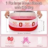 Valentine's Day Gift Baskets Set: you will receive 1 pcs large woven gift basket with handle, including text designs, 1 pcs clear plastic bag, 1 pcs pink pull bow, and 1 pcs 3D heart greeting card; The quantity and style are sufficient to meet your party gift needs Sturdy and Reliable: these Valentine's Day gift baskets empty are made of soft cotton; The gift baskets have handles on both sides and are handmade to be sturdy and durable, making them ideal for gift baskets; The clear cellophane bag and pink pull bow are made of sturdy and reliable plastic; The bright colors add a delightful and wonderful touch to your Valentine's Day party decorations Delicate Gift Choice: these beautiful Valentine's Day basket gifts feature a three color patchwork design (red, pink, and white), complemented by pink decorative flowers, letter stickers, and a gift bag, making the overall gift wrapping even more exquisite; The letter stickers can be applied or left unapplied, giving you more options; The design is good for Valentine's Day, parties, weddings, and other occasions Sturdy and Convenient Handles: handles are woven directly into the gifts' basket for enhanced durability; Each gifts basket measures 13.98 x 10.04 x 5.91 inches/ 35.5 x 25.5 x 15 cm, offering easy carrying and ample space for candies, books, or cosmetics Multi Purpose Storage: use these baskets for organizing nursery essentials, toiletries, toys, keys, or even as a decorative box; Keep your home tidy and stylish in any room