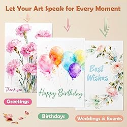 - Feature Description Paper Weight 140lb / 300gsm Material 100% Cotton, Cold-Pressed Paper Finish Textured surface, Acid-Free Ideal for DIY Greeting Cards, Invitations, Birthday, Wedding, Thank You Notes Watercolor Cards with Envelopes, 4x6 Inch, 300gsm Cotton Paper for DIY Greeting Cards, Invitations, Birthday, Wedding, Thank You Notes Unleash your creativity with this premium watercolor card set—perfect for DIY greeting cards, wedding invitations, birthday cards, and more! This pack includes high-quality watercolor cards (4x6 inches) and durable white kraft envelopes, making it the ideal choice for anyone who loves crafting unique, handmade cards. The set also comes withdecorative adhesive seals to add a personal touch to your creations. Whether you're making blank watercolor cards with envelopes for special occasions, or simply enjoying a fun watercolor painting session, this set is perfect for all your artistic projects. Premium 300gsm Cotton Watercolor Paper: Made from 100% cotton and 300gsm cold-pressed watercolor paper, these watercolor paper cards provide a textured surface that enhances water absorption, making it perfect for watercolors, inks, acrylics, pens, markers, and colored pencils. This acid-free paper ensures your artwork remains vibrant and professional over time. Durable White Kraft Envelopes: This set includes thick, high-quality white kraft envelopes to protect your artwork. The kraft envelopes adds elegance and makes them the perfect match for your watercolor cards with envelopes. Perfect for All Occasions and DIY Projects: Whether you’re making watercolor cards with envelopes for wedding invitations, greeting cards, thank you notes, birthday cards, or holiday greetings, this set provides the perfect materials for every creative project. It’s ideal for card making supplies, watercolor painting supplies, and all your watercolor card crafting needs. Great for Artists & Crafters of All Levels: Whether you're a beginner or a professional artist, this set is designed for watercolor painting, scrapbooking, card making, and DIY projects. The high-quality watercolor paper cards with envelopes offer you the perfect canvas to bring your creative ideas to life. Great Gift for Craft Lovers: This set is a perfect gift for watercolor artists, scrapbookers, and anyone who enjoys creating personalized cards. It’s great for watercolor painting, DIY crafting, and making handmade greeting cards for friends and family. Boost Your Creative Projects with this versatile set of watercolor cards and watercolor paper cards. Whether you're crafting handmade greeting cards, personalized invitations, or experimenting with watercolor painting, this set offers all the essentials you need to create beautiful, professional-quality artwork. Perfect for anyone interested in card making supplies, watercolor cards with envelopes, and all things DIY crafting.