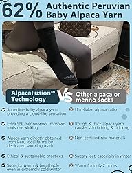 [62% Peruvian Baby Alpaca Fleece] Powered by exclusive Baby AlpacaFusion technology, blended with 9% Australian Merino Wool for cloud-like softness and superior thermal insulation ideal for winter commutes, outdoor work, or chilly nights. [2–4x Thicker than Regular Wool Socks] Thicker than standard merino wool, our socks feature a fleece lining for 2-4x insulation. Built for cold weather, socks provide superior insulation for hunting, hiking & cozy indoor wear. [ThermoToe Shield Technology] Reinforced thick toe area, our exclusive innovation designed . that keeps toes cozy & warm in freezing winter. A thoughtful gift to keep your loved ones warm through the coldest days. [Dry Feet & No Stink] Alpaca absorbs 30% of its weight in moisture, drying faster than merino. propertiesprevent odor buildup, ideal for everyday use or sports .keeping feet fresh all day. [Hidden Padding & 2X Elasti] Reinforced footbed provides full cushion, reducing foot pain & toe wear by 50%. Lycra elastic stretches 2x more, Seamless comfort for all-day wear, whether you’re hiking mountains or relaxing at home.