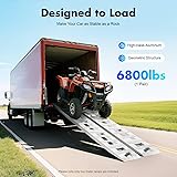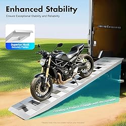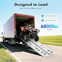Durable Aluminum Build: High-quality aluminum + welding process resists deformation. Sturdy enough for frequent loading/unloading use. 6800LBS Heavy-Duty Capacity: Premium material + stable structure supports up to 6800LBS per pair. Safely holds ATVs, lawnmowers, motorcycles, and four-wheelers. Safe Non-Slip Design: Raised slope texture + concave-convex foot patterns boost friction. Crossbar prevents backward movement; smooth edges avoid vehicle scratches. Dual Usage Flexibility: 2-piece set works for two-wheelers (use one ramp) or four-wheelers (use both). Ideal for docks, trucks, or trailers. Easy to Carry & Clean: Lightweight aluminum + hollow design for effortless transport. Smooth, open structure wipes clean with a soft cloth—low maintenance.