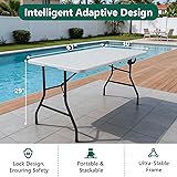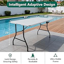 Large & Portable Folding Table for Any Occasion - This 5ft folding table (60"L × 29.63"W × 29.25"H) comfortably seats 6–8 people, making it a must-have for parties, picnics, or everyday use. The half-fold design with built-in handles makes this portable table easy to carry, weighing just 18.89 lbs. Once folded, it tucks neatly into closets, under beds, or your car trunk—perfect for those who love versatile, space-saving solutions for both indoor and outdoor use. Multi-Use Indoor & Outdoor Table - Whether you’re hosting a backyard BBQ, camping trip, or game night, this foldable table adapts to your lifestyle. Use it as a picnic table for outdoor dining, a utility table for crafts or gardening, or a foldable dining table when you have extra guests. Ideal for weddings, parties, or even your first apartment—it can serve as a dining space, work desk, or buffet setup. Pair it with a tablecloth to elevate its look and make it blend seamlessly with your decor. Sturdy Construction & Reliable Support - Crafted with reinforced steel legs and a high-density plastic tabletop, this plastic folding table supports up to 300 lbs without wobbling. The powder-coated frame resists rust and corrosion, while the durable top withstands dents, cracks, and heavy use. Strong enough for DIY projects, garage repairs, catering setups, or outdoor weddings—this utility table combines strength and stability for any task. Quick Setup & Effortless Maintenance - Setting up this folding table takes seconds—no tools required. Just unfold, lock the legs, and it’s ready to use. The smooth, waterproof tabletop wipes clean easily after arts and crafts, gardening, or dinner parties. Its weather-resistant surface won’t warp or fade, making it perfect for outdoor activities like picnics and camping. Whether you’re potting plants, crafting with kids, or hosting a casual get-together, cleanup is always quick and stress-free. Multi-Purpose Indoor & Outdoor Use - Built to last, this fold-in-Half table delivers sturdy, wobble-free performance for both indoor and outdoor activities. Ideal for entertaining, working, or relaxing, it adapts to every lifestyle need. We stand behind our product’s quality—if you have any questions or concerns, our team is ready to help. Enjoy a sturdy, reliable, and stylish folding table that’s built to make life easier and more organized.