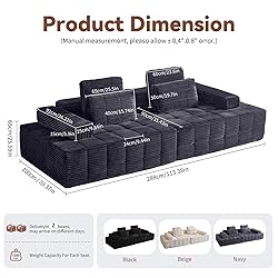 - DescriptionComplete your living room furniture sets with the minimalist sectional sofa set and create a elegant and chic atmosphere! this modern couch includes a chaise lounge for complete comfort. It’s U-shape design allows for various configurations and its ottoman is perfect for small space while still providing plenty seating. The cushions of sectional couch are filled with high resilience foam for unparalleled support. SpecificationSeat Depth: 26 inchesSeat Height: 15.75 InchesWeight Limit: 1200 PoundsProduct Dimensions: 280*92*63cm/110.24*36.2*24.8inchItem Package Dimensions: 105*37*37cm/41.34*14.57*14.57inchesNet Weight: 80.2KG/178.22PoundsGross Weight: 84.55KG/187.9PoundsBack Style: Cushion BackFill Material: High density spongeSeat Back Interior Height: 9 InchesColor: Light white/grey/blackfabric:Luxury Corduroy FabricProduct Care Instructions: Wipe with Damp Cloth, Wipe Clean with Dry ClothIncluded Throw Pillow Fill Material: Cotton Package Included1*110 Modular Sectional Boneless Sofa with 2 Ottomans Notes1. As the Light white/grey/black is shipped by vacuum compression, there may be size deviation when it is first unpacked, it is suggested that waiting 5-7 days for the lounge sofa to fully rebound to a consistent height2. Delivered in 3 parcels, Packages may arrive on different days,Please be patient and wait for all your parcels to be delivered
