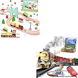 47Pcs STEM Train Set: Equipped with a variety of traffic signs, wooden houses, and trees, encourages kids to create their own town. As they play, they learn about transportation systems while enhancing their hand-eye coordination and problem-solving skills. The diverse components promote creativity Deluxe Christmas Train Tracks Set: Upon opening this charming train set enclosed in its festive Christmas gift box, a delightful 3D greeting card pops up, bringing you an overflow of blessings and immersing you in a thick atmosphere of Christmas cheer. This train set includes a remote controller, a locomotive steam engine, passenger carriages, coal carriage, cargo carriage, 16 curved tracks, 6 straight tracks, 2 Y-shaped tracks and 2 trees. Perfect for creating exciting train adventures around t Premium Wood Craftsmanship: This train tracks is made from high-quality wood, ensuring durability and safety. Each piece features smooth, hand-sanded edges. Plus, this wooden train track set is free from harmful substances like BPA and lead, prioritizing your child's safety Easy To Assemble & Play: Children can effortlessly assemble the tracks into their own unique railway designs, fostering creativity and independence. Once they've connected the train engine to the passenger car and ensured that all wheels are securely on the track, they simply press the switch to watch the train toys smoothly glide along its path and christmas train sets for around the tree The Ultimate Gift for Ages 3-8: An ideal present for birthdays, Christmas, holidays, or a surprise reward. Worried about finding the perfect gift? This all-in-one toy is the answer, guaranteed to delight any child and make you the gift hero
