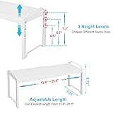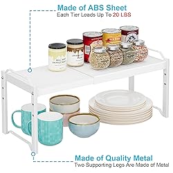 【A𝗱𝗷𝘂𝘀𝘁a𝗯𝗹𝗲 L𝗲𝗻𝗴𝘁𝗵 a𝗻𝗱 H𝗲𝗶𝗴𝗵𝘁】: ---The package includes 2 pieces of kitchen counter shelf of size (12.6”-20.5”)L * 8.26"W * 8.74"H. Both can expand length from 12.6" to 20.5" and adjust shelf height from 4.5 to 7.3 to fit your storage needs just about anywhere. 【S𝘁a𝗰𝗸a𝗯𝗹𝗲 D𝗲𝘀𝗶𝗴𝗻 𝗳𝗼𝗿 Ma𝘅𝗶𝗺𝘂𝗺 S𝘁𝗼𝗿a𝗴𝗲】: --- Our cupboard organizers and storage shelf can be stacked together or used individually, making them ideal for organizing all your dishware, kitchen accessories, canned goods, and more! 【S𝘁𝘂𝗿𝗱𝘆 & D𝘂𝗿a𝗯𝗹𝗲 】: ---The cabiner shelf is made of metal and ABS (Two supporting legs are metal, the two tier shelves are ABS). Each shelf can load weight up to 20 LBS. 【Ma𝘅𝗶𝗺𝗶𝘇𝗲𝗱 V𝗲𝗿𝘁𝗶𝗰a𝗹 S𝗽a𝗰𝗲 a𝗻𝗱 K𝗲𝗲𝗽 A𝗹𝗹 B𝗲 O𝗿𝗴a𝗻𝗶𝘇𝗲𝗱 】: ---With Our expandable and stackable cabinet organizer, you can make full use of vertical space. It will be a good choice as a organizer for cups dishes/spice bottles/cans or other kitchen supplies. Keep all of your items be organized and away from mess. 【S𝗼 Ea𝘀𝘆 𝘁𝗼 A𝘀𝘀𝗲𝗺𝗯𝗹𝗲】: Our kitchen counter shelves come with all the necessary accessories and hardware. All what you need to do is just fasten 4 screws to finish the assembling in minutes.