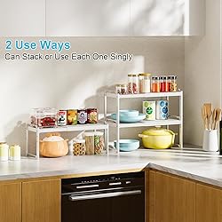 - Our cupboard organizers and storage shelf can be stacked together or used individually, making them ideal for organizing all your dishware, kitchen accessories, canned goods, and more!