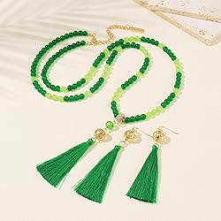 ℬ Design Vision & Aesthetic: Tassels symbolizing free flow paired with green beads embodying natural energy—this gradient design not only enriches visual depth but also perfectly caters to both your stacking and solo wearing needs! ℬ No Compromise: From the precisely spaced beads to the neatly secured tassels, and the burr-free metal hardware, every detail reflects our dedication to excellence. Indulge in a superior quality experience you deserve ℬ Find Your Fit: Red: Vibrant Vibe – Perfect for Retro or Party Looks. Yellow: Energetic Vibe – Ideal for Bohemian or Athletic Styles. Orange: Casual Vibe – Great for Street or Workwear Aesthetics. Green: Natural Elegant Vibe – Perfect for Western or Luxury Office Styles ℬ Necklace Length: 34.6 in + 2.75 in extender chain; Earring Length: 4.1 in. ℬ Service: If you have any questions or need assistance,just message us —we’re happy to help within 24 hours.