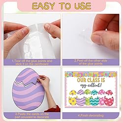 Complete Easter Bulletin Board Set: includes 91 PCS in total: 20 bulletin board borders, 21 flags, 26 colorful eggs, 6 pairs of eggshells, and the motivational phrase “Our Class is Egg-cellent”, plus 140 glue Points for quick decorating Fun Egg Photo Wall Design: create an interactive and personalized Easter classroom display! The egg cutouts allow you to add children's photos, making a delightful class photo wall that brings smiles and builds community Durable Quality: made of thick cardstock with a protective film coating, these Easter decorations are sturdy, tear-resistant, and reusable; Vibrant spring colors stay bright without fading, even after long-term use Appealing Easter Egg Design: featuring a delightful mix of Easter colorful eggs, and the playful text "Our Class Is Egg-cellent, " this Easter bulletin board set creates a cohesive and visually appealing springtime theme; Ideal for decorating bulletin boards, walls, and various classroom spaces, it adds a festive touch that students and teachers will love Multiple Usage: ideal for Easter school parties, spring classroom doors, walls, and holiday bulletin boards, these versatile Easter bulletin board boarders and paper cutouts can be applied to decorate various spaces; They are ideal for creating a cohesive and inviting environment, these Easter bulletin board decorations will help create a warm, inviting atmosphere in your classroom, daycare, or school setting