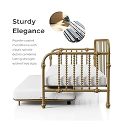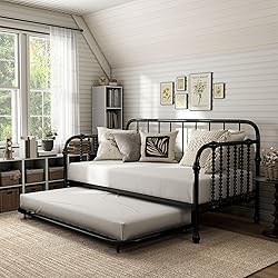 🛏️SOFA BY DAY, BED BY CHOICE: This daybed with trundle offers versatile multifunctional use, easily converting from a stylish sofa to a guest-ready twin bed. 💪ENHANCED SUPPORT: The innovative checker-box base frame provides a sturdier foundation and enhanced stability compared to standard slats for your mattress. ✨STURDY ELEGANCE: Crafted with a durable powder-coated metal frame, featuring classic spindle details that blend lasting strength with refined, timeless style. 🤸EFFORTLESS GUEST BED: The integrated trundle bed glides out easily on 3 smooth-rolling wheels, offering a quick extra twin size bed for sleepovers or guests. 🛠️EASY SETUP & CLEAN: Detailed instructions facilitate easy assembly. Along with a one-year warranty and easy clean with a dry or damp cloth.