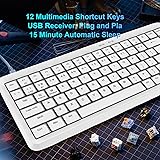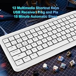 2.4G Wireless Keyboard: Plug and play, with no need for drivers. The advanced 2.4GHz wireless technology provides a robust and dependable connection with a range of up to 33 feet. There is hardly any delay or disconnection, even in the busiest environments. It can use immediately with any USB device 75% Compact 84 Keys Layout: This wireless keyboard features a tilted angle and a 75% compact 84 keys design, enabling a comfortable and accurate typing posture while preventing wrist fatigue. The quiet clicking sound allows you to focus on work or entertainment without disturbing others Automatic Sleep and Power Saving: The keyboard has an automatic sleep function. When you stop using the keyboard for more than 15 minutes, it will enter sleep mode to save power. You can activate it from sleep mode by clicking any key, and the battery life can last up to 6 months. The keyboard is powered by two AAA battery (not included) Silent Keys: With a noise reduction design, you don not have to worry about disturbing those around you, whether you are working in a quiet room or late at night. The scissor switch key technology offers a sensitive and quiet typing experience. It is compact and portable, convenient for use anywhere Multimedia Shortcut Keys: This keyboard is equipped with 12 multimedia shortcut keys, providing quick access to the media player, email, the Internet, volume, play pause, mute, computer, and favorites, allowing you to easily access your favorite websites. It is suitable for work and entertainment, saving you time and making work and life easier. Note: These 12 shortcut keys do not fully support for OS X system