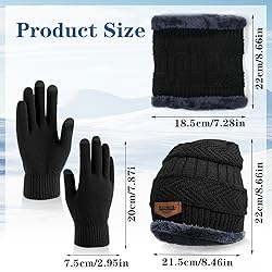 【Winter Warmth Set】 This versatile 3-piece set includes a beanie hat,a neck warmer scarf,and a pair of gloves.Designed to provide full protection for your head,ears,neck,and hands against cold wind,snow,and freezing temperatures. 【Reliable Materials】Winter hat scarf glove set is made of high-quality,thick polyester fabric.The thermal construction traps body heat effectively,ensuring exceptional warmth and comfort without itchiness,perfect for all-day wear. 【Practical Touchscreen Gloves】The tips of the thumb,index,and middle fingers of the knitted gloves are made of a special conductive material,which is sensitive to touch,allowing you to easily use smartphones,tablets,or other touchscreen devices without exposing your hands to the cold. 【One Size Fits Most】Winter knit hats scarves and gloves are all made of elastic fabric.Hat fit all head shapes,scarf is comfortable and thick,keeping your neck warm,and the gloves perfectly conform to your hands.They are suitable for most people and are unisex. 【Widely Used】Winter warm suit is suitable for a variety of outdoor activities.Ideal for skiing, snowboarding, hiking,running, commuting, or any everyday winter adventure.