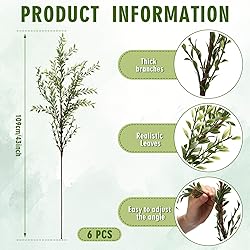 43" Tall Eucalyptus Branches: this set includes 6 extra-tall 43-inch faux eucalyptus stems designed with realistic leaves, lifelike texture, and flexible branches that bring spring natural greenery to any space Quality Faux Greenery for All Seasons: crafted from quality plastic and wire, these artificial eucalyptus branches maintain their fresh look year-round—no watering, no sunlight, no shedding, and no maintenance required Perfect for Floor Vases Large Arrangements: the tall size of artificial greenery stems makes them ideal for floor-standing vases, entryway displays, tall centerpieces, mantle decor, office decor, and modern interior styling DIY-friendly for Wedding Event Decorations: these bendable faux eucalyptus stems are easy to shape and arrange, perfect for wedding bouquets, ceremony arches, table centerpieces, party arrangements, and floral DIY projects Versatile Decor for Farmhouse Modern Homes: the subtle green blend effortlessly with farmhouse, rustic, boho, and modern decor styles, a simple way to elevate living rooms, bedrooms, kitchens, hallways, or office spaces