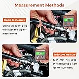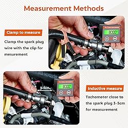 Small Engine Tachometer: IPX67 waterproof chainsaw tachometer measure petrol engines; Measuring range: 0-15000 RPM(02 Mode; Up to 30,000 RPM in 03 mode(03 mode is a doubling relationship, a multiple of 02 mode); Timing Range: 1-9999.9hours; Timing accuracy: 0.1H; Refresh Rate: 1s; Package Included: 1*Tachometer, 1*Alligator clip sensing wire, 1*User manual Two Measure Methods: clamp the spark plug wire with the clip to receive the signal; supports inductive measure, optimal sensing distance 3cm-5cm; safe and reliable; No external power connections are required, long service time; Toggle between "HOURS" and "SERVICE" modes using the intuitive "Mode" button for versatile functionality. Instantly reset total hours and maintenance time with a long press of the "Rst" button Multifunction Digital Tachometer: Tach Hour Meter, MAX RPM, RPM mode setting, RPM Alarm, Auto sleep and Reset, Battery power detection; when the battery shows low, replace the battery in time and data will be memorized and not lost; green backlit for clear visibility in all lighting conditions Three Mode Tachometer for Small Engines: 01-02-03, The 01,02,03 mode is a simple multiplier relationship, and the rotational speed value is doubled; Assuming the same engine and the same idle signal, read in 01 mode, the result is 1000 rpm, then using 02 mode to read is 2000 rpm, and using 03 mode to read is 4000 rpm Widely Application: Induction tachometer suitable for any gasoline engine, like chainsaws, hand-push lawn mower, weed whacker, motorcycle, off-road vehicle, beach car, snowmobile, go kart, gliders, automobiles, engineering vehicles, ATVs, motor boats, grinders, generators, vibration machine mechanical equipment etc