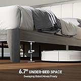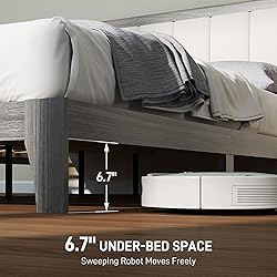 - Enhance your bedroom with the HOMCOM queen size bed frame, featuring a chic beige linen-look fabric upholstered headboard and a stylish wood grain frame. This elegant platform bed offers plenty of under-bed space for storage and easy cleaning by automated robots. Its robust structure supports up to 726 lbs., providing great stability for a restful sleep.