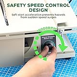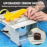 - ADJUSTABLE SPEED--Equipped with a high quality 1380W motor, high performance and low vibration, our rock saw for cutting rocks can rotate up to 15,000 rpm by adjusting the speed knob, choose the right speed to achieve different levels of grinding and cutting. SECURITY DESIGN--Engineered for safety, our rock saw features a soft-start function activated by a control knob, preventing sudden acceleration for secure operation. It is comprehensively outfitted with a blade guard, a sink, a detachable slide rail, offering a secure and complete cutting solution. VERSATILE AND COMPACT--This jewelry lapidary saw combines a bench buffer and table saw for integrated polishing and cutting, it is suitable for grinding, polishing and drilling jade, wood, beeswax and other materials, and also features a flexible shaft for precise, detailed work or hard-to-reach areas. The body is compact and stable and won't take up too much space, making it a good choice for amateurs! EXTENSIVE ACCESSORIES--Our mini rock saw comes with a complete set of accessories, including flexible shaft, drill chuck and sanding pad, as well as 240-Grit sanding papers*5 and other parts required for the installation, so that you can start working on your table saw polisher as soon as you receive it! IMPORTANT NOTE--This saw is not a substitute for a dedicated woodworking table saw and does not include a riving knife, which is standard for this product category.