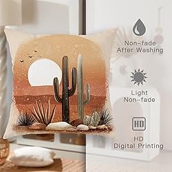 - This decorative pillow cover brings a touch of the desert into your home. With its stunning cactus and sunset design, it creates a warm and inviting atmosphere that complements any summer decor. The terracotta cream colors blend seamlessly with various furnishings, making it versatile addition to your living space. Ideal for enhancing sofa or bed, this pillow cover is both stylish functional. Easy to maintain, provides comfort while elevating home's aesthetic.