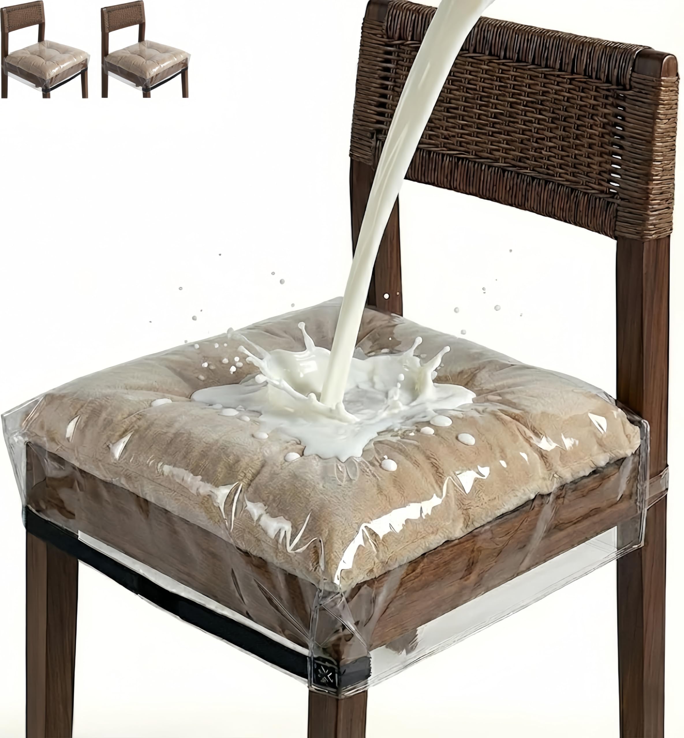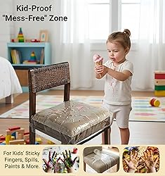 𝐅its 𝐋arge 𝐖ide 𝐂hairs (𝟏𝟗-𝟐𝟐 𝐈nch): Designed specifically for larger dining furniture, these plastic seat covers feature an expanded width of 19-22 inches (Depth: 16-18"). While standard covers are too tight for wide seats, our spacious design is "capable of" covering broad cushions without ripping, ensuring full protection for your grand dining set. 𝟑𝟔𝟎° 𝐍on-𝐒lip "𝐌agic 𝐓ape" 𝐒ecurity: Unlike standard covers that rely on elastic and slide off when you sit, our upgraded design features a heavy-duty Black Magic Tape (Velcro) strap. This allows you to tighten the cover for a flexible, custom fit. It locks the protector in place, ensuring it never slides off, even when restless kids or guests shift in their seats. 𝐖ipe and 𝐆o "𝐌ess-𝐅ree" 𝐊ids 𝐒hield: Create an invisible barrier against family chaos. These waterproof vinyl covers prevent oil, juice, and sticky food spills from ruining your fabric upholstery. Used for feeding toddlers or messy eaters, the liquid-proof surface allows you to wipe messes away instantly with a damp sponge—keeping your dining room chairs permanently stain-free. 𝐂at 𝐒cratch 𝐃eterrent: Stop your pets from ruining your furniture. While cats naturally love digging their claws into textured fabric, our smooth clear cushion protectors eliminate the friction they crave. This commonsense design effectively discourages scratching behaviors, saving your expensive upholstery from claw marks and hair shedding. 𝐇eavy-𝐃uty and 𝐂rystal 𝐂lear: Engineered for daily durability, our soft PVC material is reinforced to withstand tension and movement. The high-transparency design lets your chair's original pattern shine through, while the 4-inch height and adjustable strap provide a neat, tailored look that doesn't feel bulky. Pro Tip: Use the Velcro strap to cinch any excess material for a tight, professional finish.