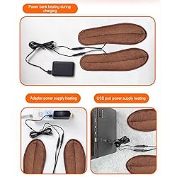 - Features: Beat winter cold feet with our USB Rechargeable Heated Insoles—your must-have winter essential for men and women! Perfect for commuting, hiking, outdoor work or home relaxation, these insoles deliver customized warmth and all-day comfort. Don’t let cold feet hold you back—add our USB Rechargeable Heated Insoles to cart now and step into a cozy winter! Heated insoles: High-quality materials ensure sophisticated heat distribution over a wide area. The entire surface of your foot is evenly supplied with pleasant warmth. Comfort you won't want to be without in winter. Size: 35-36 , 37-38 , 39-40 , 41-42 , 43-44 , 45-46, for men and women. Insole Material: EVA Cleaning Method: Washable. Keep the plug dry. Air dry completely first. Includes: USB cable: 1 pair of insoles, 1 charging cable USB cable+adapter:1 pair of insoles, 1 USB adapter,1 charging cable Precautions 1. Unplug the power cord when not in use to avoid prolonged heating. 2. Elderly people and children should use this product under supervision. 3. Avoid wearing heated insoles during strenuous exercise to prevent damage to the heating wire. 4. Heated insoles can be cleaned like regular insoles. Do not soak them in water for extended periods. Please ensure they are completely dry before use. Important Notes: 1. Actual product colors may vary slightly due to lighting effects and photography angles. Thank you for your understanding. 2. Manual measurement may cause slight discrepancies in size.