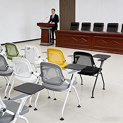 【Comfortable Seating Experience】Our folding chair combines comfort with style; the breathable mesh backrest promotes airflow to keep your back dry. The curved backrest design aligns with the spine's natural curve, effectively relieving spinal pressure. 【Multi-Functional Writing Board】The folding office chair features a premium retractable writing board that resists high temperatures and wear. The spacious writing surface accommodates textbooks and notebooks simultaneously. 【Tray Design】This writing-pad-equipped folding office chair serves as an ideal alternative to standard desks, easily movable to accommodate group collaboration needs. 【Versatile Applications】Suitable for bedrooms, living rooms, offices, schools, reception areas, and conference rooms—meeting diverse needs for hosting guests, interviews, study, and work. 【Convenient Storage】The seat and straight armrests fold upward for effortless storage.