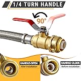 【3/4" MIP x 3/4" Push to Connect Ball Valve】Experience the ultimate convenience with our 3/4" water heater connector. Its push-to-connect ball valve end attaches instantly to PEX, copper, PE-RT or CPVC pipe without soldering, glue, or special tools, while the 3/4" MIP end screws on easily for water filter system. The integrated valve allows for immediate water shut-off during installation or maintenance, making this water heater supply line a complete, time-saving solution. 【Certified Safe for Your Drinking Water】Rest assured with our certified water heater supply line. The lead-free brass fittings and stainless steel construction meet cUPC and NSF-61 standards for potable water. This certification guarantees that the flexible water heater hose is safe for your family's drinking water and reliable for long-term use in hydronic heating systems. 【Universal Compatibility】Designed as the ultimate water hose for water heater and water filter system, it works seamlessly with all common pipe materials including PEX, copper, CPVC, and PE-RT. The 3/4" water heater flex line is your go-to solution for new installations, replacements, or repairs, ensuring a perfect fit and function in any system configuration. 【Perfect Alignment & Emergency Shut-Off in One】This versatile 24 inch water heater flex line solves misalignment issues between your heater and existing plumbing. The flexible braided stainless steel body bridges gaps effortlessly, and the built-in quick-fit shut-off ball valve provides instant flow control for safety and convenience during repairs or emergencies, eliminating the need for a separate valve. 【Professional-Grade Durability & Performance】Built to last, our water heater hose features super high-tensile 304 stainless steel braiding for strength and kink-resistance, coupled with premium lead-free brass fittings. It's rated for a robust 200°F and 200 PSI, ensuring reliable, leak-free performance in both residential and commercial hot water supply line applications.