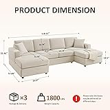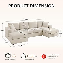 Soft Chenille & Dual Chaise Design: Experience cloud-like comfort with our ultra-soft, durable chenille fabric. This U-shaped sectional is designed for spacious lounging, featuring two extended chaise lounges (left and right) that invite you to stretch out and relax. Available in Beige, Mint Green, and Gray to suit any decor Generous U-Shape for Social Living: With a total length of 118 inches, this generous U-shaped sofa provides ample personal space for everyone. The unique layout - featuring two chaises and a central two-seater - naturally fosters conversation and togetherness, making it the perfect centerpiece for family time and entertaining Built for Lasting Comfort & Support: Enjoy unwavering support thanks to a sturdy solid wood frame and high-resilience foam cushions. Each seat is designed for optimal comfort, while the robust construction (supported by multiple legs) ensures stability and a weight capacity of up to 1,800 lbs for long-lasting durability Easy-Care Fabric & Simple Maintenance: Chenille is both luxurious and practical. For daily care, regular vacuuming is recommended. Most spills can be spot-cleaned promptly with a mild detergent and damp cloth, then blotted dry. Always avoid harsh chemicals and excessive rubbing to maintain the fabric’s softness and color 3-Box Delivery & Worry-Free Service: Your sofa arrives securely packaged in 3 boxes (which may arrive separately). Our dedicated customer service team is ready to assist with any questions. We back your purchase with a 1-month return policy (for unused items) and a 1-year warranty for your peace of mind.
