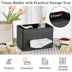 - Sumnacon Tissue Box Cover with Storage Tray, PU Leather Rectangle Long Tissue Box Holder for Vanity Counter Table Desk Toilet Tank, Decorative Facial Tissues Organizer for Bathroom Living Room Bedroom WHY DO YOU WORTH TO HAVE THIS DECORATIVE TISSUE BOX!!! Creative Design - The tissue box cover with tray design can not only help you to put tissues but also help you store some small items such as: perfume, earrings, necklaces, nail polish, watches, stationery, toiletries, etc. It's a perfect little container that keeps things organized. Simple but modern style make the tissue box not only a cube tissue box cover in you home but also an elegant decoration to any place you put it. The stylish tissue holder can not only be used in your home anywhere but also perfect used for a wedding table centerpiece or venue decoration. And it's really a Ideal Gift for House warming, Wedding, Anniversary, Special Occasions, Christmas, New Year. Specification: Color: Black Material: PU Leather+ MDF Package included: 1 X Tissue Box Cover for Home & Office Notice: 1. This may makes 1-2 cm differences due to manual measurement; 2. Due to the difference in light and screen, the color of the product may be slightly different from the pictures.