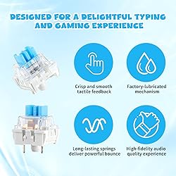 【Package Content】The package contains 30 pre-lubricated 3-pin plate-mounted tactile keyboard clickers, which provide smooth actuation and rebound, making them ideal for custom keyboards or upgrades 【Clear Housing Design】These mechanical switches feature a transparent blue casing, making them ideal for pairing with LED backlighting and providing excellent tactile feedback for a pleasant typing experience 【Quality Material】Made of plastic housing, copper washers, and high-quality springs, these blue switches are waterproof and dustproof, durable, and have a service life of up to 50 million cycles 【Wide Compatibility】Compatible with most keyboards, these keyboard switches are ideal for users who value feel and performance, making them ideal for typists and gamers 【Factory-Precision Lubrication】Each keyboard switch is machine-lubricated to reduce friction and noise, ensuring smooth, consistent keystrokes and plug-and-play reliability for a superior typing experience