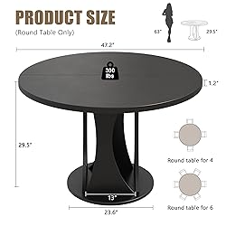 Ideal for Family Dining: With a diameter of 47 inches, this round dining table comfortably accommodates 4-6 people for daily meals. Its smooth curved design provides ample dining space while preventing accidental bumps, creating a cozy and comfortable dining experience for you and your family Elegant Arcs Design: Flowing double-arc lines bring dynamic beauty and an elegant atmosphere to your space. Blending modern styles with retro details, this round kitchen table easily complements a variety of home styles. Available in 4 colors—black, white, walnut, and natural—it achieves the perfect balance of practicality and aesthetics Space-Saving & Comfortable: Generous space under the dining table for 4 enhances seating comfort, while chairs can be fully tucked underneath when not in use, saving valuable floor space. This makes it an ideal choice for compact living areas and small homes Sturdy Structure: Holds up to 300 lbs, the dining room table features a 4-layer reinforced structure: a double-arc body paired with a seamless MDF tabletop, a round base, and 6 non-slip foot pads. The surface is waterproof and scratch-resistant, while the pads ensure protect your flooring—combining durability with safety Easy Setup: Each circle kitchen table comes with detailed instructions and all necessary hardware. Assembly typically takes about one hour. If you have any questions during setup, our support team is ready to assist to ensure a smooth, worry-free experience