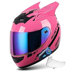 Black/Pink Cat Ear Bluetooth Motorcycle Helmet for Men Women, Cool Bat Knight ATV Motobike Full Face Helmet with Visor, Adult Unisex Moped Scooter Motocross Racing Crash Helmets, DOT Approved