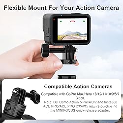 Sturdy & Durable: Durably stretchable with three-level tightness adjustments, this mount can secure your camera to poles or mesh structures, unlocking various unique shooting angles. The camera base can rotate freely, enabling 360° rotation and 180° tilt adjustments. Equipped with a quick-release button, it allows for one-click disassembly. Wide Application: It is made of super high quality silicone, can flexible mount on bicycle, motorcycle, dirt bike, fishing rod, selfie stick, extension pole, roll bar, tube, handlebar, gym and more. Note: This product can be used on the handlebars of bicycles or motorcycles. Due to the elasticity of the product material, it may slightly shake when driving on bumpy roads. It is recommended to use it on flat roads. Wide Compatibility: This wrap band strap mount is compatible with Go Pro Hero 13/12/11/10/9 MAX, DJI Osmo Nano Action 3/4/5 Pro/6, Insta360 X5/X4/X3/Ace Pro 2. NOTE: When using it with DJI and Insta360 cameras, there is a connector or 1/4" screw camera adapter required. Packing List: MINIFOCUS Flexible Mount × 1, MINIFOCUS Locking Screw × 1