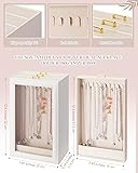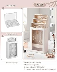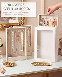 3 Layer 30 Hook Storage: measuring about 12.6" x 7.9" x 5", the necklace organizer box features 3 spacious drawers equipped with 30 convenient hooks in total; The vertical 3 layer design separates necklaces into different areas, allowing you to store all your necklaces in an orderly manner; The rational layout of the hooks makes use of the internal space, meeting the storage needs of those who own multiple necklaces of varying lengths and styles Nice Quality Material Combination: the necklace storage box applies PU on the exterior and soft velvet as the interior lining; The soft and smooth velvet provides gentle care for your necklaces, preventing scratches and friction that may damage the jewelry surface; The PU exterior presents a delicate appearance while ensuring the box's reliability for long term use Clear Lid Protection Display: the storage case comes with a clear lid that enables you to see each necklace inside at a glance; Meanwhile, the clear lid serves as a protective barrier, keeping dust away from your necklaces and reducing the need for frequent cleaning; Your necklaces can stay clean and shiny for a longer time, and you can quickly select the right necklace to match your outfit according to the clear display Tangle Free Vertical Design: the vertical storage design allows you to hang each necklace independently on the hooks, eliminating the trouble of necklace tangling that often happens with traditional storage methods; You can easily take out the necklace you need without spending time untangling knotted chains; This design also helps maintain the shape of necklaces, especially those with pendants, preventing them from getting twisted or deformed during storage Thoughtful Occasion Gift: the necklace storage box is a thoughtful gift option for the important women in your life, including mothers, girlfriends, wives, daughters, sisters, close friends, classmates and colleagues; It is suitable for gifting on occasions like Valentine's Day, Mother's Day, birthdays and anniversaries; The practical function and delicate appearance of the organizer box can meet the needs of jewelry lovers, showing your care and consideration for the recipients