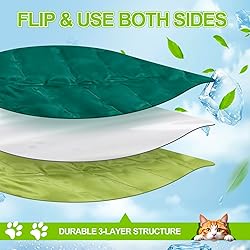 Dual Sided Gel Cooling Charming Leaf Design: the cat sleeping mat is covered with gel on both sides and can be applied on both sides; It comes with a large leaf shape, featuring one dark green side and one light green side, building a nice and cozy summer atmosphere for lovely pets, and it can also be presented to cat owners Versatile Applicability for Multiple Scenarios: the 18.5 x 27 inches large leaf shaped cooling mat for cats is suitable for floors, pet beds, sofas, chairs and nests, fitting into any environment seamlessly; Wherever you head to, your pet can enjoy having its own cool resting place with this mat Long Lasting Coolness: the natural gel material keeps cool and refreshing even in scorching summer days; No need to plug in, physical cooling is safer, preventing the risk of electric shock caused by cats biting the cooling pad, and it brings a secure resting option for your pet Anti-slip Feature, Convenient Storage: crafted with wear-resistant gel material, the cat cooling mat can withstand pets' daily activities and is not easy to shift; It can be stored easily when not applied, and taken out again in hot seasons to help pets regulate body temperature and stay cool and comfortable Dirt Resistant Surface, Effortless Cleaning: this leaf-shaped dog cooling mat is more dirt-resistant thanks to its special material; Simply wipe it with a damp cloth to get rid of dirt, realizing easy cleaning; It does not stick to hair, keeping pets' resting space fresh and hygienic