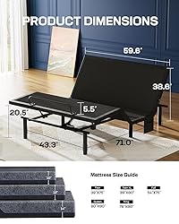Five Smart Preset Positions: Experience instant comfort with one-touch modes for any activity. Our adjustable bed base offers specialized settings like Reading, TV, Gaming, Anti-Snore, and Sleep. The innovative Anti-Snore mode gently raises the head to minimize snoring and enhance peaceful rest. Three-Speed Full-Body Vibration Massage: Melt away stress and muscle tension with our integrated massage system. Select from three intensity levels—gentle, medium, or intense—for wave-like, full-body relief that promotes deep relaxation at the end of a long day. Split King Dual-Zone Customization: When two Twin XL bases are combined to form a Split King setup, this adjustable bed base allows for completely independent head and foot adjustments on each side. Achieve your ideal sleeping position without disrupting your partner, or easily synchronize the bases when desired. Integrated Lighting and Power Hub: Navigate safely at night with the gentle, wireless remote-controlled under-bed LED light—perfect for seniors or pregnant users—which avoids harsh glare. This adjustable bed base also features built-in Type-A and Type-C USB ports on both sides and convenient side pockets to keep your essential devices and personal items powered and within easy reach. Superior Quality and Universal Mattress Compatibility: Built to last, the heavy-duty dual motors have been rigorously tested for over 50,000 cycles, ensuring reliable performance. This adjustable bed base seamlessly accommodates all 8- to 14-inch mattresses (including memory foam, hybrid, latex, and spring) and is protected by a 1-year worry-free warranty.