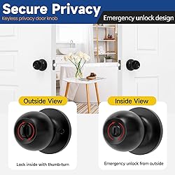 【Premium Material】Interior door knobs are made from premium quality stainless steel, which is both rust-resistant and anti-oxidising. The black door knobs interior are finished with electroplating technology for anti-corrosion, and are also anti-fingerprint and durable. 【Privacy door knob Function】This black interior door knob designed for residential interior doors. Bedroom door knobs with lock ideal for use in the bedroom, bathroom, office, or any other privacy place by locking the inside without a key to secure your privacy. 【Universal Size Compatibility】Adjustable latch to fit 2 3/8" or 2 3/4"(60-70mm) backsets. Door knobs interior with lock fits on 1 3/8" to 1 3/4" thick doors. Compatible with door thickness of 1.38-1.77in (35-45mm), this indoor door knob meets most indoor door size requirements. 【Modern Design】The doorknobs for interior door are available in a modern, round ball design. Bed and bath door knobs have no sharp edges and are rounded to avoid hurting hands. 【Easy Installation】Door knob with lock bedroom fits both right-handed and left-handed doors. You can install this easily with a screwdriver. Just tighten the screws with the screwdriver and you can install it in minutes.