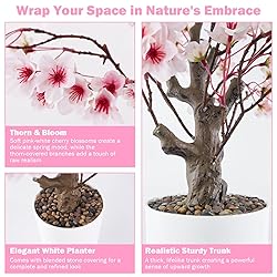 - Cherry Blossom Magic: 24-Inch Decorative Sakura Tree Step into spring with this enchanting 24-inch artificial cherry blossom tree, designed to bring a touch of serene nature indoors and out. Each delicate pink blossom is subtly kissed with a hint of white, creating a light, airy display that brightens any space. Thoughtfully crafted with elegant details, the tree is set in a minimalist white pot, accented with small decorative pebbles, while its textured branches feature subtle thorn-like touches for an organic, natural feel. Crafted from safe, non-toxic materials, this faux sakura tree offers effortless maintenance—no watering, sunlight, or pruning required. After shipping, simply unfold and gently arrange the branches to restore its graceful, full shape in minutes. Perfect as a tabletop or floor accent, it enhances desks, living rooms, bedrooms, kitchens, weddings, and party centerpieces alike. A meaningful and lasting gift, it carries the symbolism of luck and wellness, making it a beautiful addition to any home or office.