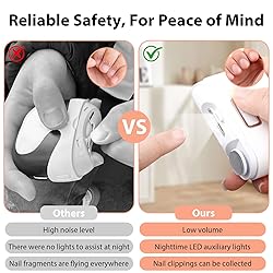 SAFE ELECTRIC NAIL CARE FOR ALL AGES:Designed with a hidden rotating blade and protective groove, this electric nail clipper ensures gentle trimming without cutting skin. Ideal for baby fingernail clippers, toddler nail clipper use, and safe daily grooming for adults and seniors at home MULTI-FUNCTION NAIL FILER ELECTRIC DESIGN:This electric nail file combines trimming and smoothing in one device. Suitable for finger nail clippers adult users, nail clippers for women, and electric nail clippers for seniors who need precise control with minimal effort and reduced hand strain QUIET OPERATION FOR BABIES AND TODDLERS:Low-noise motor allows stress-free trimming even while babies sleep. Perfect as baby nail clippers and baby electric nail file, helping parents care for newborn nails safely without frightening sounds or sudden movements BUILT-IN LED LIGHT & NAIL STORAGE:Integrated LED light improves visibility for accurate trimming, especially helpful for seniors. Enclosed nail collection chamber keeps trimmed nails contained, making this electric nail clipper hygienic, mess-free, and suitable for indoor use RECHARGEABLE & PORTABLE FOR DAILY USE:USB rechargeable battery provides long-lasting power for home or travel. Compact size fits easily in handbags or drawers, making it ideal for electric nail file routines, toenail clippers for seniors, and everyday nail grooming needs