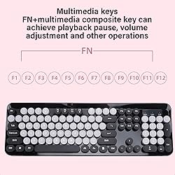 Stable 2.4GHz Wireless Connectivity: Enjoy a clean, wire-free workspace with reliable plug-and-play 2.4GHz wireless technology. The single 2-in-1 USB receiver pairs both keyboard and mouse instantly from up to 35 feet away, requiring no software and saving a valuable USB port on your desktop or laptop. Unique Vintage Typewriter Experience: This wireless keyboard features charming retro-style round keycaps and a tactile typing feel inspired by classic typewriters. It provides a comfortable and enjoyable typing experience while adding a touch of personality and vitality to your home office or desk setup. Convenient Multimedia Shortcuts & Full Layout: Enhance your productivity and entertainment with 12 dedicated multimedia hotkeys. Combined with the FN key, they offer instant shortcuts for music, volume, email, web browsing, and more. The complete 104-key layout includes a numeric keypad for efficient data entry. Quiet Operation & Power-Saving Design: The included cute mouse ensures silent clicks, perfect for shared spaces like offices or libraries. Both the keyboard and mouse feature an energy-saving auto-sleep mode that activates after 8 minutes of inactivity, extending battery life while waking instantly with a single click. Extensive Plug-and-Play Compatibility: This keyboard and mouse combo offers wide compatibility and works seamlessly right out of the box. It supports major wins operating systems (2000, ME, Vista, 7, 8, 10) and is ideal for use with desktop PCs, laptops, and even smart TVs for a simplified setup.
