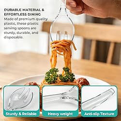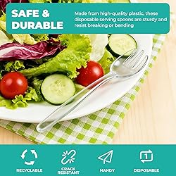 【Sturdy and Durable】Crafted from premium and heavy-duty plastic, these plastic serving utensils are engineered to not easy bending and breaking even when serving dense foods like pasta or cold salads. They are no unwanted plastic taste is transferred to your food, offering a safe and clean serving experience every time. 【Ergonomic Design】The plastic serving forks are designed with wider, contoured handles that distribute pressure evenly across your palm, significantly reducing hand fatigue during prolonged use. This ergonomic focus makes them ideal for extended use. 【Large Capacity for Efficient Serving】Our disposable serving forks have strengthened, securely hold heavy portions of salad or sides. This enhanced capacity, combined with the sturdy build, ensures efficient and hassle-free serving for your guests. 【12-Piece Value Pack】This serving utensils set includes you need for any gathering: 12 Sturdy Forks (9.84"). This versatile assortment meet the need to purchase multiple packs, making it the perfect all-in-one solution. Their compact size allows for easy storage and portability, ready to be grabbed for any occasion. 【Disposable Design for Any Occasion】Designed with durability in mind, these utensils are thick enough to be gently hand-washed and reused, offering other value beyond disposable use. Whether you're hosting a large catered event, a backyard birthday party, a picnic, or need sturdy cutlery for buffet, this set handles it all. They provide the perfect balance of disposable convenience and reusable, ensuring you're always prepared for celebrations.