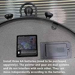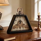 AMERICAN VINTAGE STYLE: Embrace a striking vintage aesthetic with our retro table clock, featuring gold-brushed black handles and distressed interior details. This clock adds a unique touch to your office, living room, bedroom, or dining room. DYNAMIC GEAR MOVEMENT: Watch as the intricate gears rotate continuously, simulating the captivating motion of a mechanical watch. This dynamic visual effect enhances the clock's mechanical charm and appeal. SILENT OPERATION: Enjoy a peaceful environment with our premium silent movement. Whether in your bedroom or study, this clock operates without the disturbing ticking sound, ensuring your space remains serene and comfortable. DURABLE CONSTRUCTION: Crafted from a robust iron frame and a composite wood base, this clock offers lasting durability. Each piece is hand-painted and welded, showcasing unique craftsmanship with natural fading and weld marks that tell its story. INDEPENDENT DUAL-SYSTEM: The clock features a dual-system design, allowing the pointer and gear systems to operate independently based on the installed batteries. Please note that the distressed finish and hand-crafted details are intentional elements of its design.