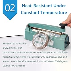 - PTFE tape features a smooth surface, high temperature resistance, and excellent adhesion, making it suitable for applications such as sealing, heat sealing, and electrical insulation. Material: PTFE (PEFT) Temperature Resistance: 260℃ Length: 10 meters Thickness: 0.13mm/0.18mm/0.25mm Width: 200mm 【Product Applications】 Used for heat insulation and cooling in sealing machines/vacuum machines/bag making machines, etc. High-temperature insulation protection for equipment and machine wiring. Anti-stick treatment for the surface of various drying machine drums. Anti-stick treatment for the surface of laminating machine drums: guide rollers, pressure rollers. Other applications requiring anti-sticking, anti-coloring, and reduced friction on various workpiece surfaces. Note: Measurement error is ±3 mm. Due to differences in lighting and displays, the actual product color may differ slightly from the image.