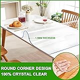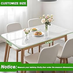 Durable Clear Table Mat: The clear table cover protector is made from high-quality 1.5mm thick PVC material,it’s waterproof, oilproof, scratchproof, no plastic smell with round corner design.This crystal clear tabletop protector is completely transparent and allows you to show off the beauty of your tabletop. Tranparent plastic tablecloth can also protects your furniture from scratches, abrasions, stains, spills and damages, keep it clean and tidy for a long time Multi-functional Protection: Our thickness clear table cloth cover is heavy duty the non-slip surface keeps the protector securely in place, preventing it from sliding or shifting.With enhanced heat resistance up to 176°F (80°C), it comfortably accommodates warm plates and cups. The table pad also has a certain cushioning effect, which can reduce the collision and sound generated when the tableware is in contact with the desktop, and can provide you with a comfortable living experience Easy to Clean: Our waterproof and transparent table pad is easy to clean. Our plastic vinyl desk top pad is waterproof and heat resistant, so when the Plastic Tablecloth get stained with oil, ink, coffee, etc., Just wipe the vinyl table cover with a damp cloth, and all the mess on its surface will be effortlessly removed.And for colored stains, we recommend that you wipe it promptly Customizable Size: Our table mat protectors are available in a variety of sizes to suit your needs. We recommend starting by measuring the length and width of your table. Then, select the size that best matches your table from our range of options. We also can make any shape and size for you. Additionally, you can easily trim the protector with scissors to achieve a perfect fit Multi-Scene Use: This versatile protector can be used in a variety of environments, perfect for dining tables, wooden tables, office desks, writing desks, coffee tables, countertops, vanities, dressers, chests, drafting tables, glass tables, nightstands, office chairs, and hard floors