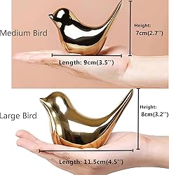 - THE KUTIR Small Golden Blessing Birds Statue Brings Us Peace and Love. Modern simplicity style golden bird decorative ornaments are made by ceramics and coated with a layer of gold. The surface is pretty shiny and has a sturdy, smooth touch, but easy to get scratched. Please handle fragile products with care. Also, please notice that the color of birds may vary depending on different lights.Lovely Little bird ornament can decorate your living room, bedroom, bathroom, kitchen, bookshelf, TV cabinet, nightstands, mantelpiece, tabletop, etc., projecting a bright, homey and artistic atmosphere in your house or office.Nicely packaged cute gold bird figurine is a perfect small crafted gift choice for your Lovers, Friends, or Family to celebrate special and precious moments in life.Birds Exquisite Size: Gold Bird Medium: 2.7’’H x 3.5"L; Gold Bird Large: 3.2’’H x 4.5’’L; Gold Bird XL: 4’’H x 5’’L.