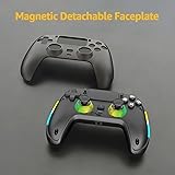 【Hall Effect Joysticks 】The wireless controller for PS-5 comes with Hall Effect joysticks , giving you pinpoint accuracy and ultra-fast response control for an edge in your games 【Dynamic Adaptive Triggers 】Heighten Your Senses, discover deeper, highly immersive gaming experiences that bring the action to life in the palms of your hands. 【Built-in Mic】The controller's built-in mic picks up voice audio with impressive clarity, filtering out background noise so your tactical discussions come through loud and clear—taking your gameplay to the next level. 【2 Back Buttons】This Gaming controller with 2 back buttons support programming or mapping, let you perform complex actions, like combos, without taking your thumbs off the sticks, giving you more control and speed 【Magnetic Detachable Faceplate】Snaps on firmly with a strong magnetic hold, no tools required. Swap or replace covers in seconds for an instant style update. Precision-engineered for a sleek fit and long-lasting durability. Perfect for changing up your look anytime. 【Turbo Function】The Turbo function lets you spam the button by simply holding it down. It automatically repeats the press for a rapid-fire action. 【RGB Light】The gamepad features customizable RGB lighting that you can personalize to match your game. This not only adds a visual flair but also enhances the overall ambiance of your gaming experience.