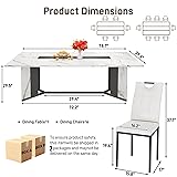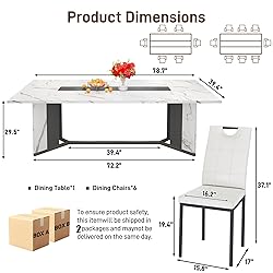 Dining table set can accommodate 6 people: This dining table set contains 1 extra-long dining table and 6 leather chairs. The table size is 78L X 39W X 29Inch. This eye-catching dining table lays the ideal stage for a gathering of 6 8 people, and the spacious waterproof table provides a rich dining table that is perfect for family dining, entertaining, or daily entertainment purposes. Special Structure: The legs on this farmhouse dining table are made of a metal frame and thick wooden board legs. The dining table has thick wooden legs combined with metal support columns to ensure excellent stability and load-bearing strength, supporting up to 300 pounds while creating compelling architectural statements. The adjustable feet on the bottom ensure proper use on uneven floors. Excellent Comfort: Equipped with 6 PCS soft and comfortable leather chairs, this 6pcs dining chair set has a 37.1-inch curved backrest that fits the curves of the human body for unparalleled comfort. Whether you are immersed in the joy of dining or focusing on work in the office, you can feel the gentle support like a cloud to relieve fatigue throughout the day. Fashionable Color: This large rectangular kitchen table has exquisite lines and a simple yet stylish design. The desktop adopts a white and black color-blocking design, replacing the demand for runners. The frosted finish has the characteristics of waterproof, oil-dispensing and scratch resistance. Whether you like the farmhouse look, modern aesthetics, or other unique styles, this dining table can complement a variety of decorative themes. Multi-scene Application: This large dining table is suitable for all occasions. It can be used not only as a dining table, breakfast table, but also as a coffee table, a casual table, a work desk, or a desk. The product contains installation instructions, and each component is labeled for easy and quick assembly. Two boxes: one box contains a dining table and the other contains 6 dining chairs.
